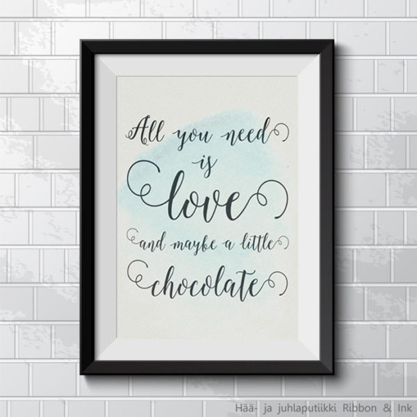 A4-kokoinen printtitaulu, jossa teksti All you need is love and maybe a little chocolate. Painettu korkealaatuiselle, paksulle kartongille. Kehykset eivät sisälly hintaan.